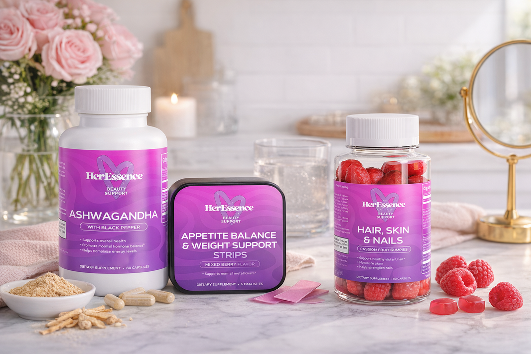 From our Hair, Skin & Nails Gummies for outer glow to our Ashwagandha for inner calm, each product supports a different facet of your wellbeing. The Appetite Balance Strips, Gut Health Chewables, and Probiotic + Metabolism Strips work in harmony to support daily balance. Discover the full spectrum of your potential with Her Essence.
